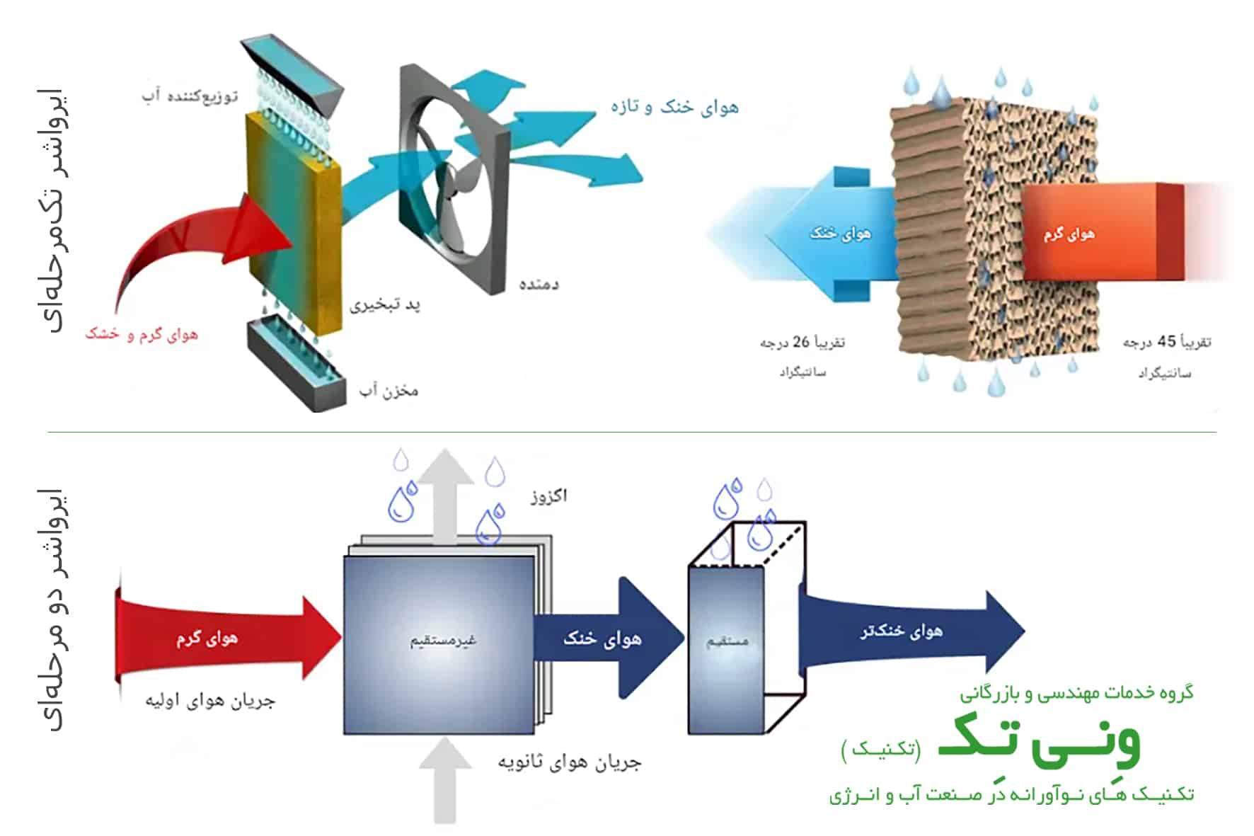 • ایرواشرهای تبخیری: با استفاده از تبخیر آب، هوا را خنک می‌کنند.