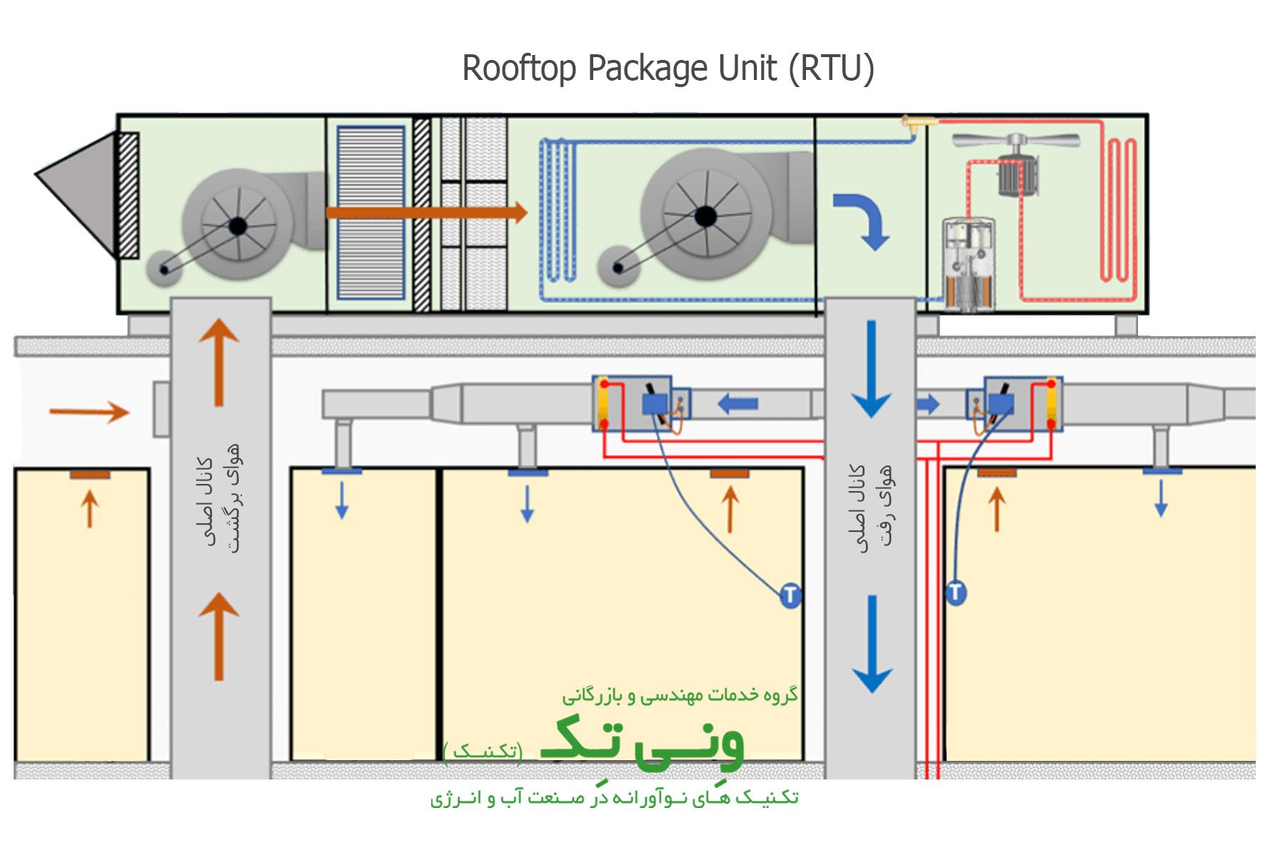 فناوری: ترکیب پکیج یونیت هوای خنک با سیستم گرمایش گازی یا هیتر الکتریکی.